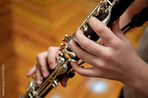 Close up of children's hands playing the clarinet in a music studio
