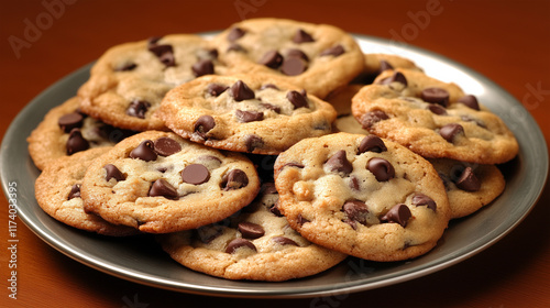 close up of chocolate chip cookies on plate