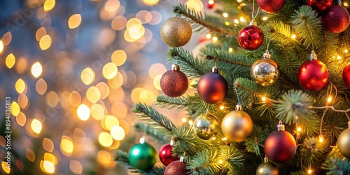 Close up of Christmas Tree with Ornaments and Lights Generative AI