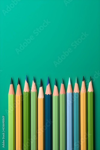 Close up of colorful Pencils lined up in front of a green Background. School Background with Copy Space