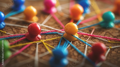 close up of colorful push pins on a corkboard with strings, concept: Career, networks, connections, teamwork, 16:9