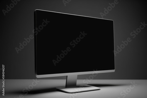 Close up of computer monitor with blank screen and copy space on black background using generative ai technology