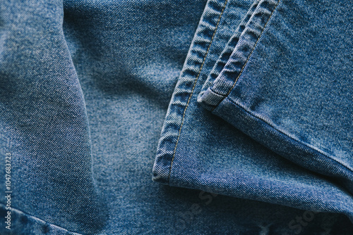 Close up of dark blue denim jeans on wooden background. Denim texture on wooden background