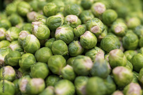 Close up of delicious and colourful vibrant brussel sprouts on a market stall in England, United Kingdom