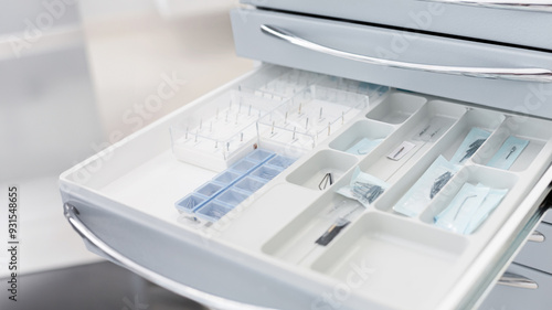 Close up of dental drill needles in open drawer, dental tools and equipment concept