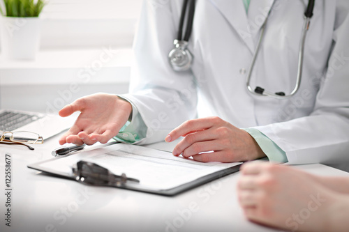 Close up of doctor and patient sitting at the desk near the window in hospital