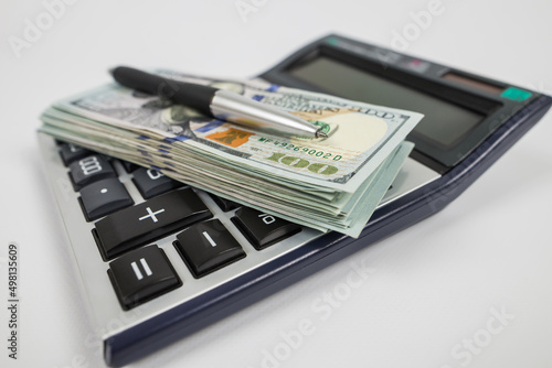 Close up of dollars pen and big calculator