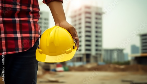 Close up of engineer hand holding yellow hard hat on construction site background, Generative ai