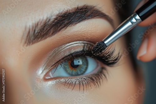 Close up of eye makeup. Applying mascara on lushes of young woman getting make up with brush by make up artist