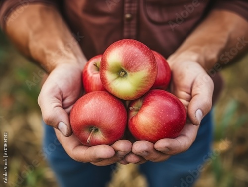 Close up of farmer male hands picking fresh apples. the front view. Organic food, harvesting and farming concept