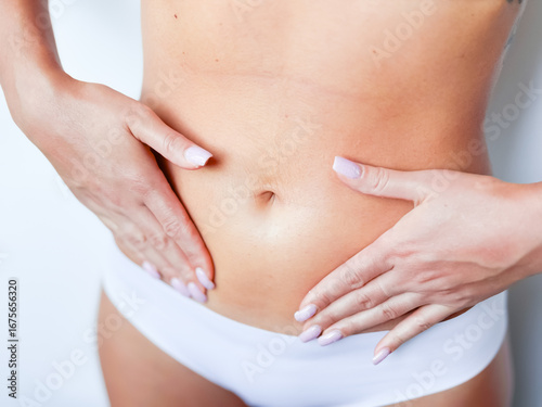 Close up of female caucasian young adult in white underwear touching flat stomach