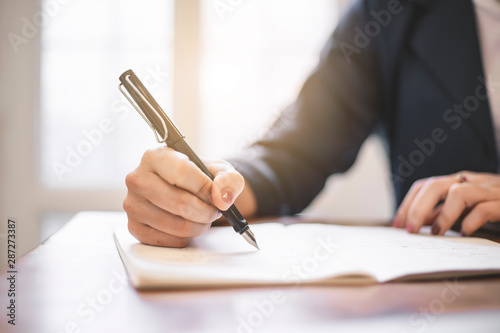 Close up of female hand writing on the book.