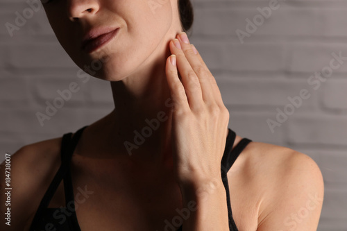 Close up of female neck and shoulders. Woman thyroid gland control.