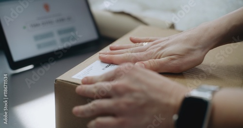 Close Up of Female Shipping and Receiving Clerk Putting Sticker with Track Number on Cardboard Parcel with E-Commerce Order, Scans Code, Preparing for Delivery. Warehouse Facility of Postal Service.