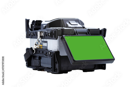 Close up of fiber optic fusion splicer machine with green screen display for telecommunications and network installation
