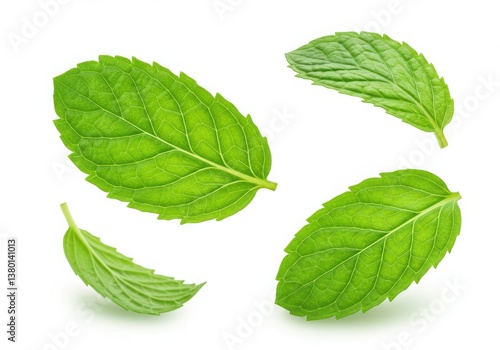 Close up of four fresh green mint leaves isolated on a white background in a studio setting