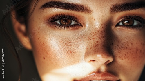 Close Up Of Freckled Face With Brown Eyes And Makeup