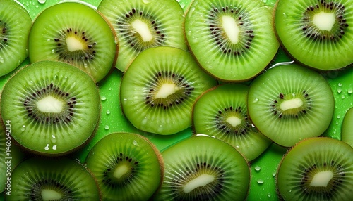 close up of fresh kiwi slices with water droplets on vibrant green background
