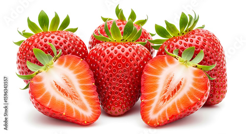 Close up of Fresh Vibrant Strawberries Ripe strawberries whole and sliced showcasing their vibrant red color and texture against white background strawberries fresh fruit red