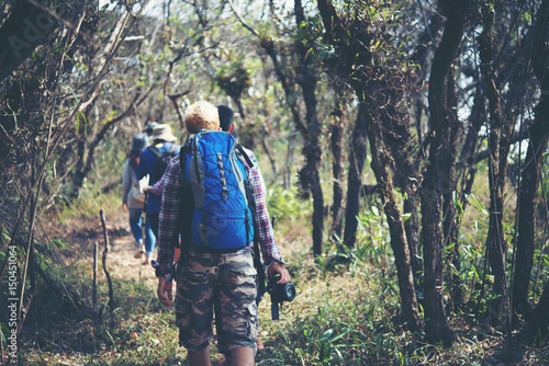Close up of friends walking with backpacks in woods from back.