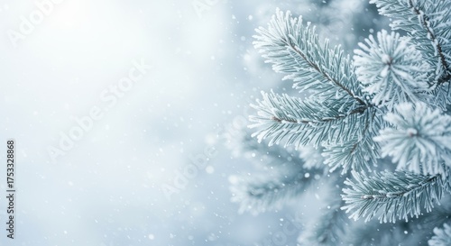 Close Up Of Frost Covered Pine Tree Branches In Falling Snow christmas winter