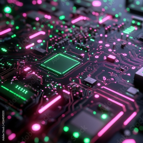 Close up of futuristic microchip with green circuits and pink lights