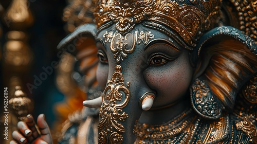 Close up of Ganesha Statue with Golden Ornaments and Intricate Details