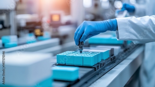Close up of gloved hands placing light blue square objects on a conveyor belt in a modern factory setting.