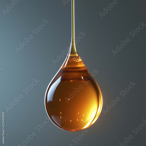 close up of golden oil droplet suspended in air, showcasing its smooth surface and reflective qualities. background is softly blurred, enhancing droplet clarity and shine