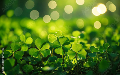 Close up of green clovers and green bokeh and room for text
