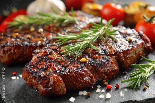 Close up of grilled steak with rosemary and spices on a black slate plate ready to be served now