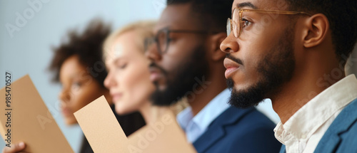 Close up of group of voters reading candidates plan, showcasing diverse individuals engaged in electoral process. Their focused expressions reflect importance of informed voting