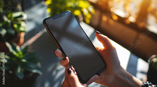 Close up of hand holding a smartphone, cropped hand holding smartphone with black screen mockup for display your graphic banner.