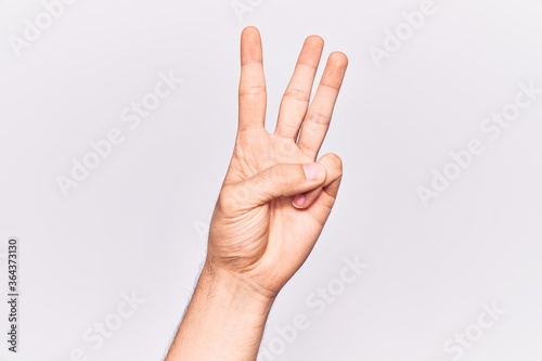 Close up of hand of young caucasian man over isolated background counting number 3 showing three fingers