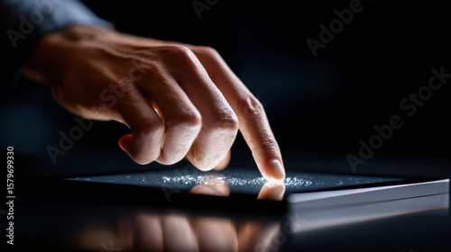 Close up of hand touching digital tablet screen dark environment, highlighting technology use and interaction, with focus finger contact with screen, creating sense of modern digital engagement
