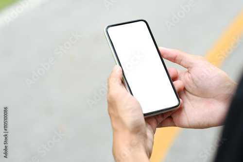 Close up of hands holding a smartphone with blank screen against blurred paved road