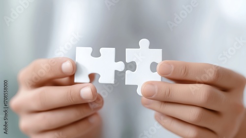 Close up of hands holding puzzle pieces symbol of teamwork collaboration and business success.
