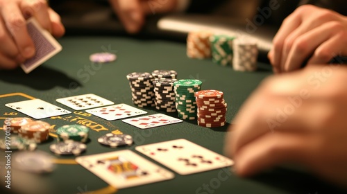 Close Up of Hands Playing Poker with Chips and Cards on Green Felt Table