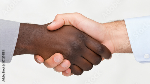 Close up of handshake between two people with different skin tones symbolizing agreement and cooperation in business or friendship