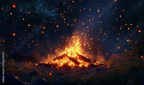 Close up of hot campfire with flame and sparks burning outside at night.