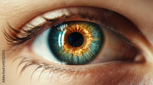 close up of human eye with digitally enhanced iris, featuring intricate patterns and vibrant colors, symbolizing technology and human connection