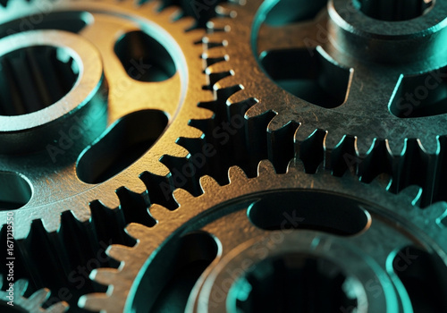 Close up of interlocking metal gears in a mechanical system with teal lighting
