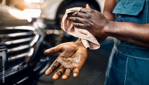 close up of interracial mechanic cleaning greasy dirty hands with an old rag at car service