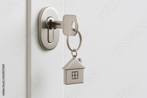 Close up of key with mini house keychain inserted in white door lock, symbolizing home ownership and excitement of new beginnings