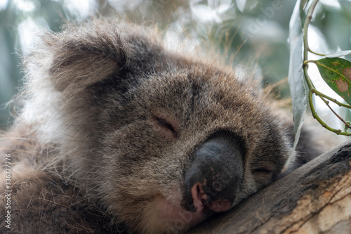 Close up of Koala sleeping in tree focusing on head eyes and ears into sunlight backlight