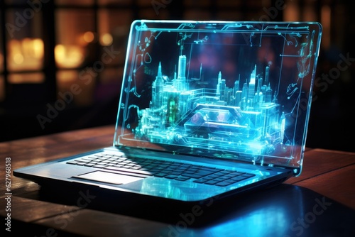 close up of laptop over space, hologram technology. Generative AI
