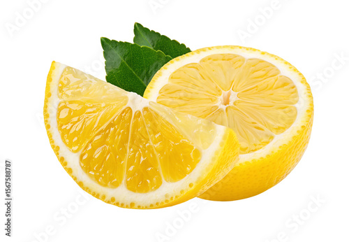 Close up of lemon slices with green leaves on a black background in a studio shot picture style