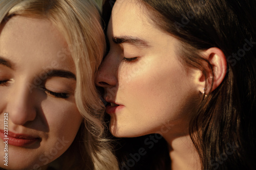 Close up of lesbian couple embracing. Girl whispering words of love to her girlfiend. Lesbian love concept.