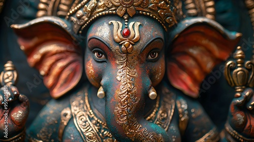 Close Up of Lord Ganesha Statue with Gold Decoration