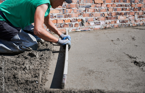 Close up of man builder placing screed rail on the floor covered with sand-cement mix at construction site on the roof. Male worker leveling surface with straight edge while screeding floor.